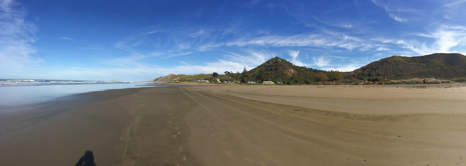 While I was perusing the aisles for pie ingredients, Louise and Grace bought picnic supplies at the farmer’s market. So after the market, Louise drove us on a scenic tour (which wasn’t a stretch considering there is not one corner of NZ that is not scenic!!) and we ended up at Ocean Beach. It tugged at my heart a little to know I was looking straight back across the water to Los Angeles, where I had just left a few days earlier. A baguette, a bag of feijoa fruit and an apple pie-thing (more like a danish) made for a good snack. And the World Piece apron made for a good tablecloth!