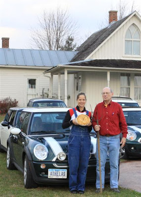 When you live in the American Gothic House you never know who — or what — is going to turn up on your doorstep. Case in point: yesterday, a group of 15 MINI Coopers, driving in two groups from Des Moines and Cedar Rapids, converged in Eldon, Iowa. Looking like escapees from “The Italian Job,” first they assembled in the American Gothic House Center’s parking lot. They seemed to know the drill. They backed into the parking spaces, bumpers perfectly lined up, and out came the cameras.