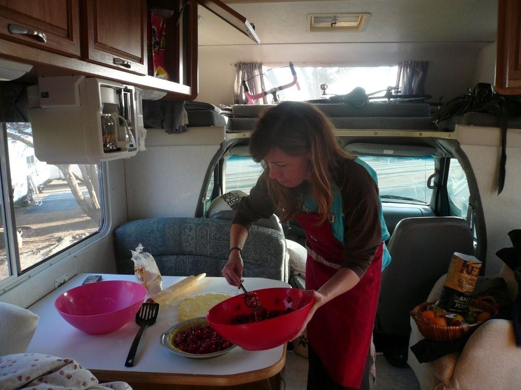 It was the first pie made in the RV. We bought four pounds of fresh cherries on our way north, stopping at the grocery store in Malibu to stock up on pie ingredients and other supplies.