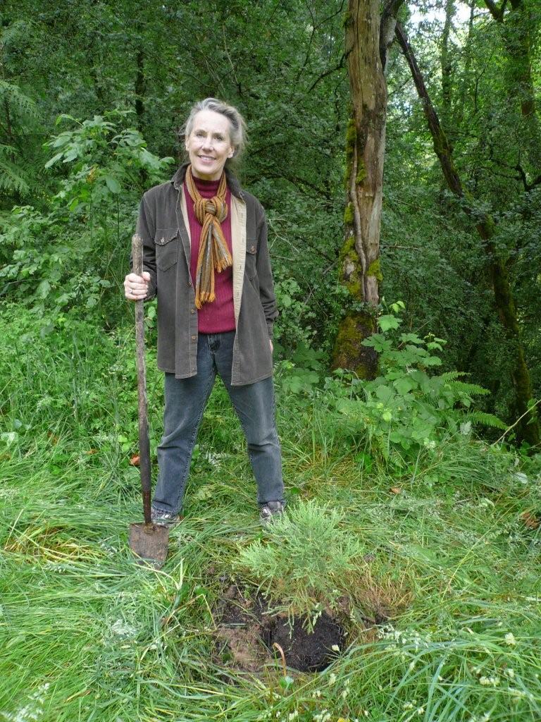 Sylvia and I finally set about to our original plan for Marcus’ birthday morning– we planted a baby Redwood tree in Forest Park. The spot was strategically chosen for its proximity to two other Redwoods already growing there (“Redwoods need to be in families, they share roots,” Sylvia explained). The location also happened to be at the lower end of the large meadow – the meadow where Marcus had spent countless hours throwing the stick for our dog, Jack – closer to Sylvia’s house making it more convenient for her to water the tree. That it’s illegal to plant trees in Forest Park didn’t stop us from hiking in with two shovels and the huge tub that held the sapling –in broad daylight. I love Sylvia for this – and for having the idea to plant the tree in the first place.(PHOTO: That’s the beautiful Sylvia, above, with her shovel. I hope this proof of illegal activity doesn’t get her arrested!)
