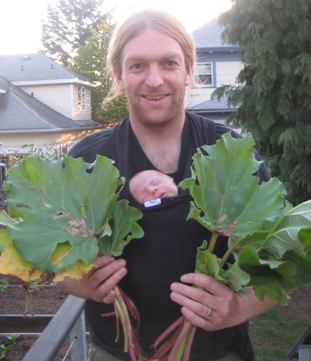We polished off that pie in one night. Damn that stuff is delicious! As we rubbed our full bellies I wasn’t dwelling on the bitterness any longer, only the pure sweetness. I was thinking about how much the new baby added to our evening together, suprised at how much I felt her presence (even though the only noise she made came from her diapers) and how just having her laying there next to us breathing and observing she contributed such positive energy to our gathering. I couldn’t imagine Lyndsay and Andreas without her. She was part of their lives now. She was part of mine too. I already can’t wait to go back and hang out with the family. I just hope the rhubarb grows back quickly so we can have more of that amazing pie.