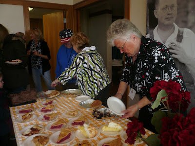 | Pie builds community. Always. In Eldon, even the mayor (Shirley Stacey) helps serve slices — with Grant Wood looking over her shoulder. Shirley’s peach pie (and recipe) features in my book. |