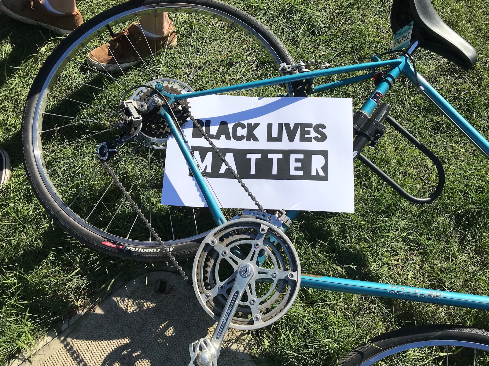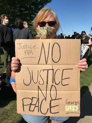 An organized protest had taken place at 2:00. We stumbled upon the tail end of it (though in reality, the protests are ongoing with some springing up spontaneously). The streets were closed and cars were replaced by people of all colors and ages—groups of Somali women wearing long dresses and head coverings, a middle-aged white guy on his bike wearing a Martin Luther King T-shirt, a young girl with purple hair in a shirt with the words “WE ARE ALL EQUAL” in bold letters. Almost everyone, including us, was wearing a mask. Many were holding up homemade signs made from cardboard scraps that read: Black Lives Matter. Justice for George. No justice, No Peace. RIP George Floyd. And the most gut-wrenching one, I Can’t Breathe.