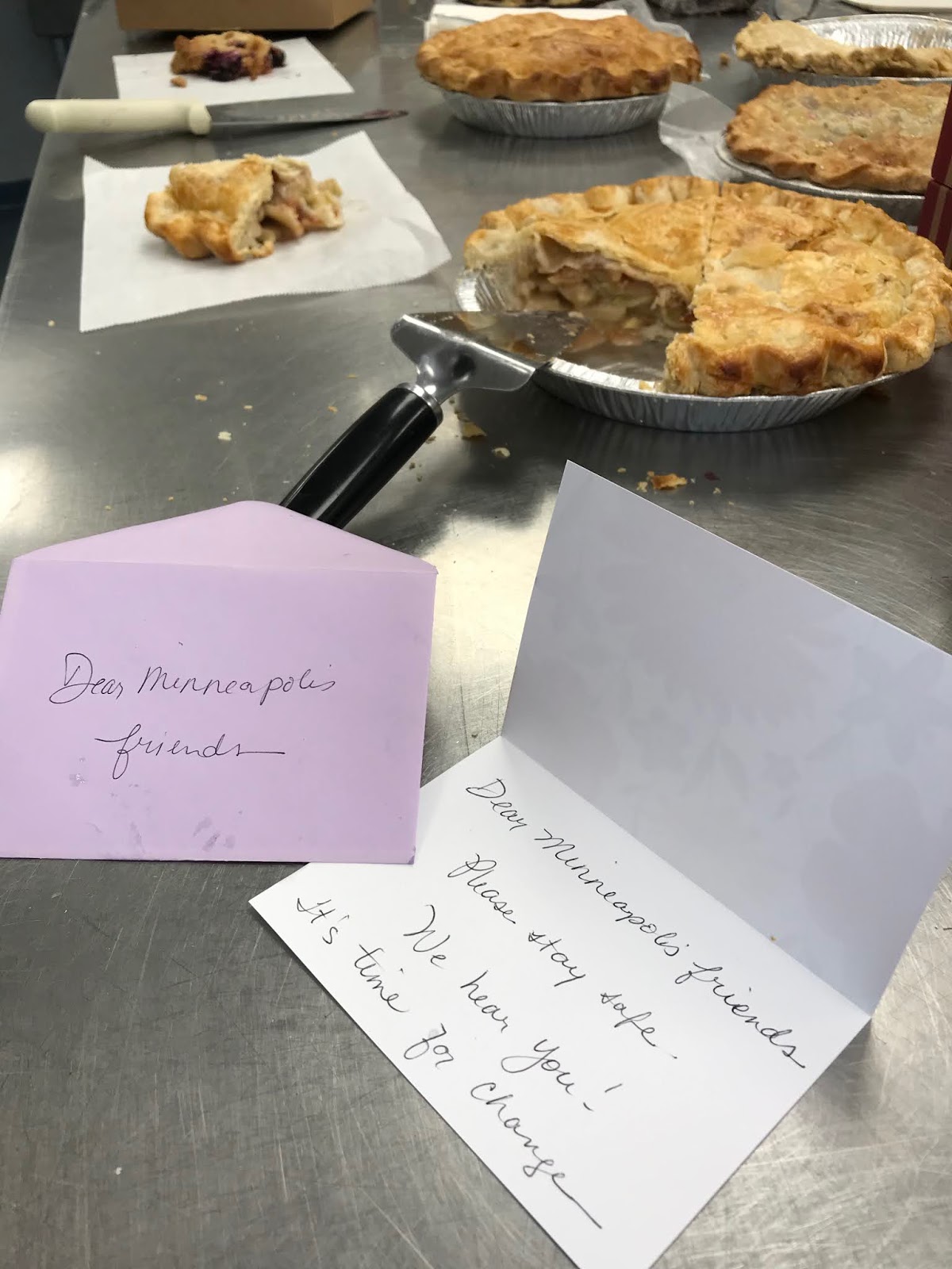 At the very last minute—because this was all last minute—Sarah, a neighbor who lives only one mile away, had offered to drive to Minneapolis with me. We spoke on the phone late Friday night and I picked her up the next morning. It didn’t matter that we had never met. I knew that anyone whose heart was crying out I need to do something! loud enough to jump in a car with a stranger—during a pandemic, no less—would be an instant friend. Besides, I have seen over and over how pie serves as a catalyst for connecting people.