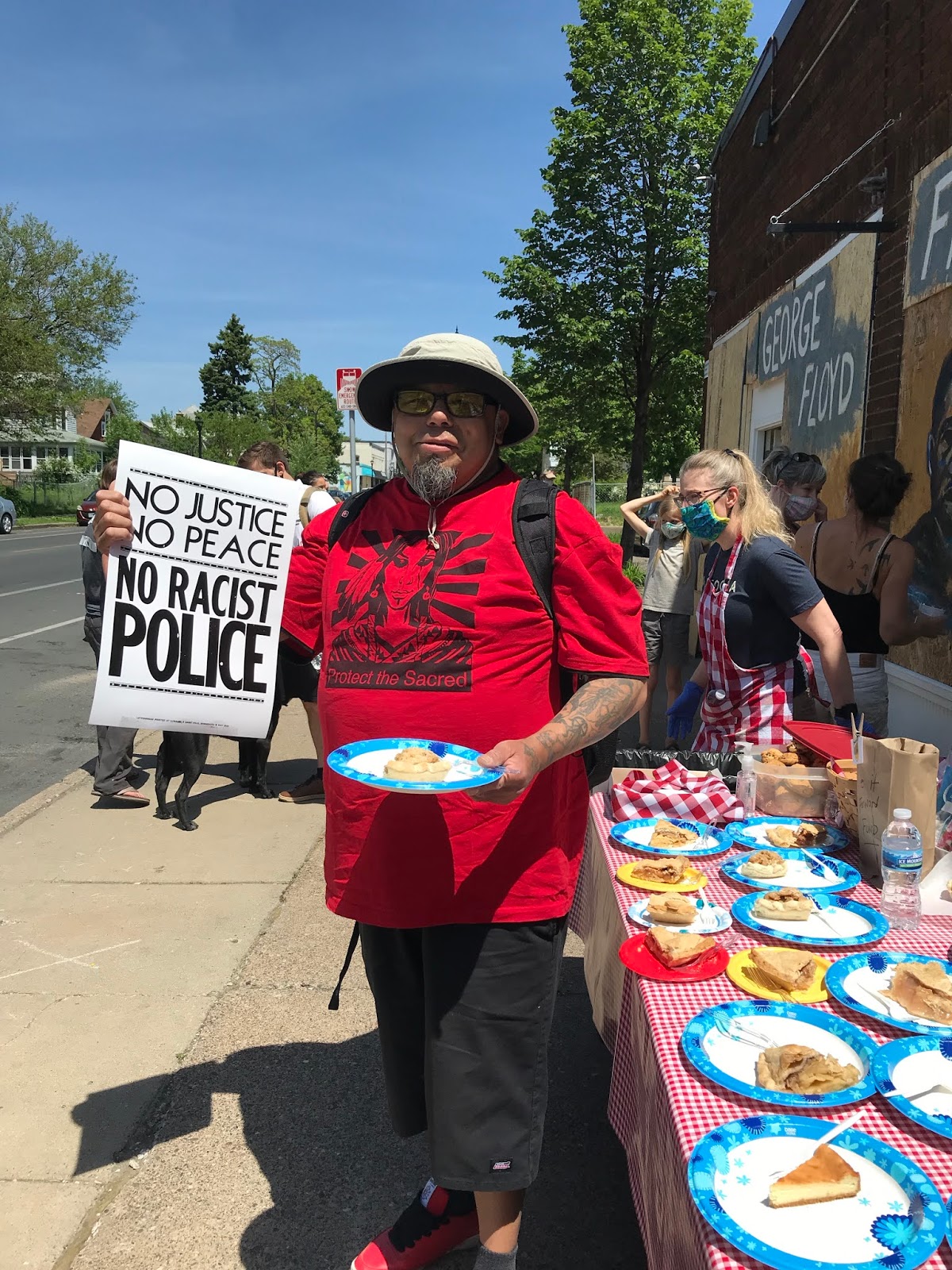 We had discussed other possible places for handing out pie. Maybe it would be safer if we were outside a church, we had mused. But being at Pie and Mighty would prove to be an ideal location, just far enough removed from the fast-growing crowd down the street to be manageable, and close enough to serve the foot traffic, a steady stream of mourners taking bouquets of flowers to place at the memorial, tired cleanup crews, and families with their kids in tow to educate them on why racism must stop.