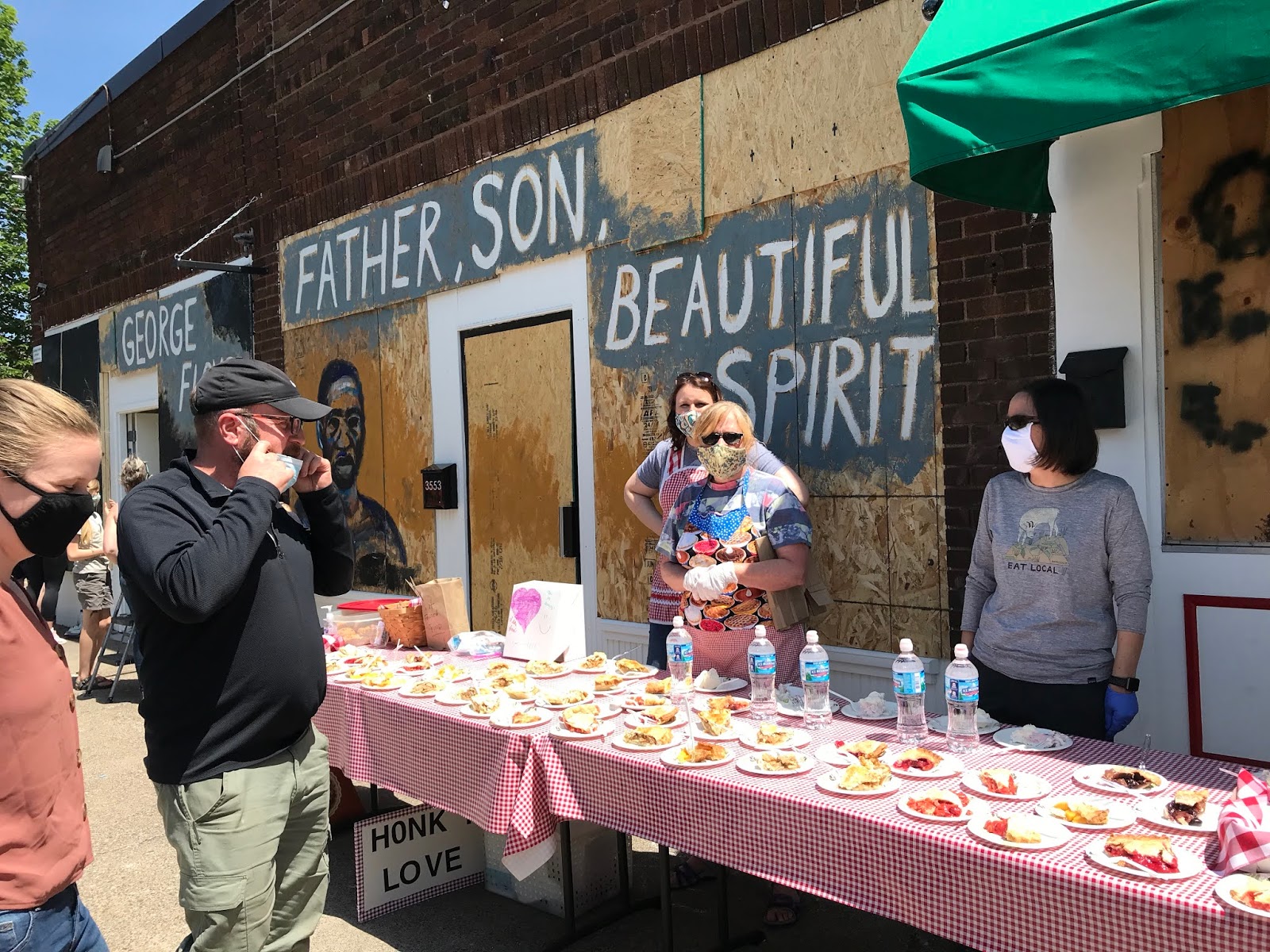 Our crew of volunteers for the day was comprised mostly of people I had never met. Tina, Xan, Marie, and Carol, all from Minneapolis—and Sarah from Iowa—were there because they had seen my post on Facebook. A woman named Desra, a friend of my friend Esther, had come to help. She was from Donnellson, the same small town as Sarah and me. She knew Sarah from working together years earlier at a café. That they were both at Pie and Mighty was a coincidence. The only people I knew were Therese and Rachel. But to see us all working as a team, suited up in face masks and food service gloves, slicing pies, doling out plastic forks, and offering pie to passersby, you would have thought we were all longtime friends. Similar to how protests bring people together, the desire to bring comfort to others through pie, united us with a common cause. We may not have known each other before this day, but like individual strips of dough woven into a lattice crust, our lives would forever after be intertwined.