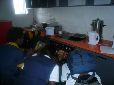 The students never lost interest, even after the pies went into the ovens. Here (above) a group keeps watch over one of the two ovens we used. This was helpful as the ovens were on two different floors.