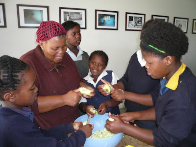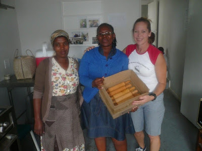 Here we are in one of the two kitchens. The woman in blue (center) is Mpumi, who coordinated the pie class, with the rolling pins washed and ready for the next class. Yes, I’m teaching a second pie class tomorrow.