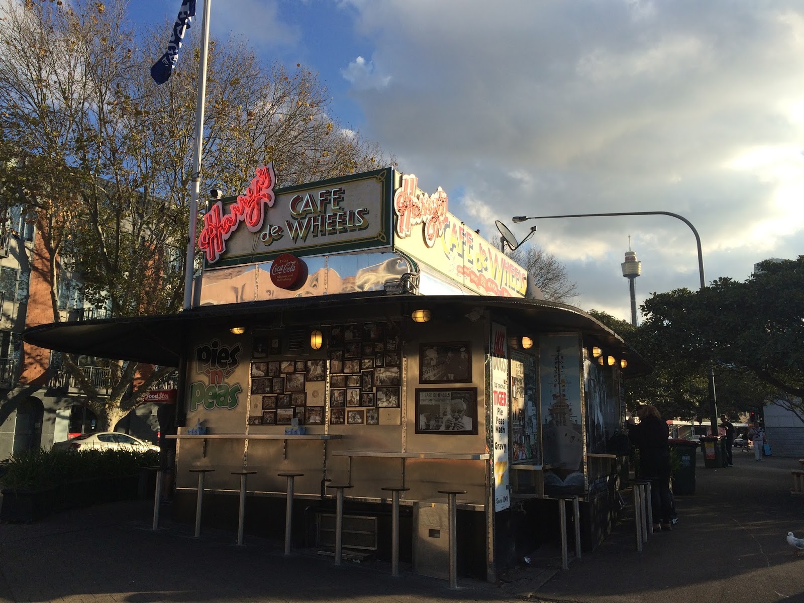 Kate took me for a long walk around the city on my first day there. We walked straight into a pie shop! Called Harry’s Cafe de Wheels, this famous place is a Sydney institution, around since the 1940s. Probably one of the first food carts — long before they became popular — Harry’s sits on the waterfront of a wharf where military ships dock. No wonder they’ve been so successful — they serve the ultimate comfort food: meat pies topped with mashed peas, mashed potatoes, and gravy.