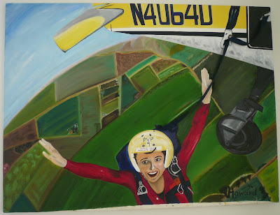 One of her self-portraits, titled “Sky Diver,” showing my sister jumping out of a plane, arms spread wide with the curved earth beckoning below, hangs in my living room. It may not be deemed worthy of a Southeby’s auction but the energy and boldness this painting emits makes it priceless to me.